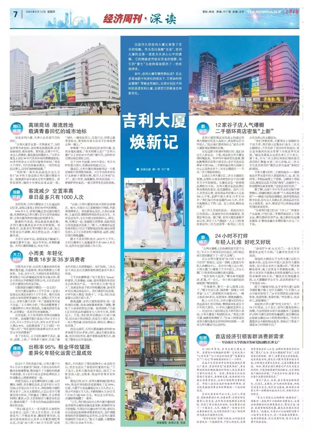 “以前,吉利大厦是传统百货的运营模式。如今,大部分人已逐渐倾向于网购、代购等消费形式。其他新商业项目,大多以电影院、儿童乐园、博物馆等体验类业态为主。尤其是近些年,主打大而全的购物中心,将吃、喝、玩聚在一起,更能吸引消费者,因此传统百货也就逐步没落了。”眼下,天津城市运营发展有限公司(以下简称城运发展)商业运营负责人王子正负责吉利大厦改造、运营,追忆往昔仍难掩遗憾。
