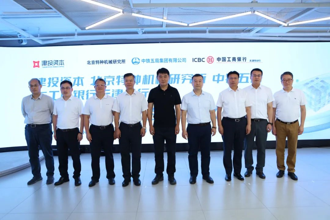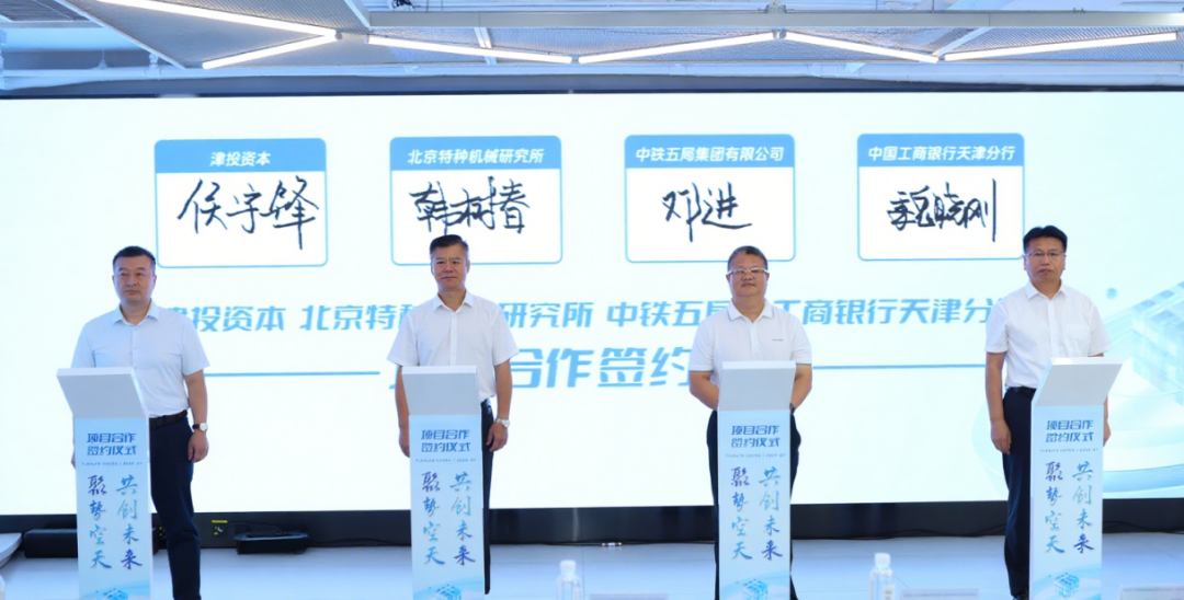 7月29日,津投资本与北京特种机械研究所、中铁五局集团有限公司、工商银行天津市分行举行“磁电空天港项目”合作签约仪式。市国资委一级巡视员王志勇,北京特种机械研究所副所长韩树春,中铁五局集团有限公司副总经理、华北区域指挥长邓进,工商银行天津市分行副行长魏晓刚,津投资本党委书记、董事长侯宇锋出席签约仪式。